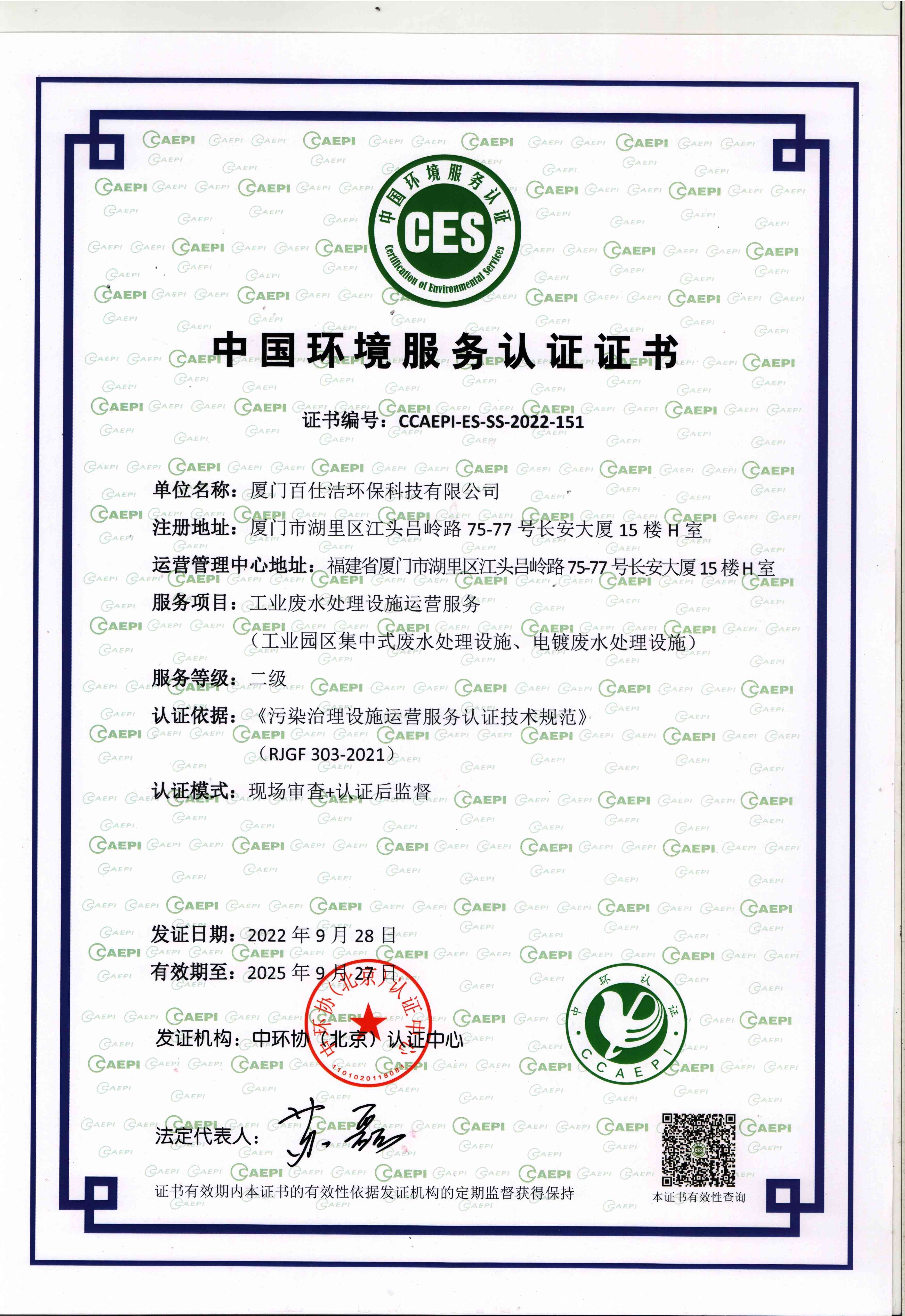 中國環(huán)境服務(wù)認(rèn)證證書